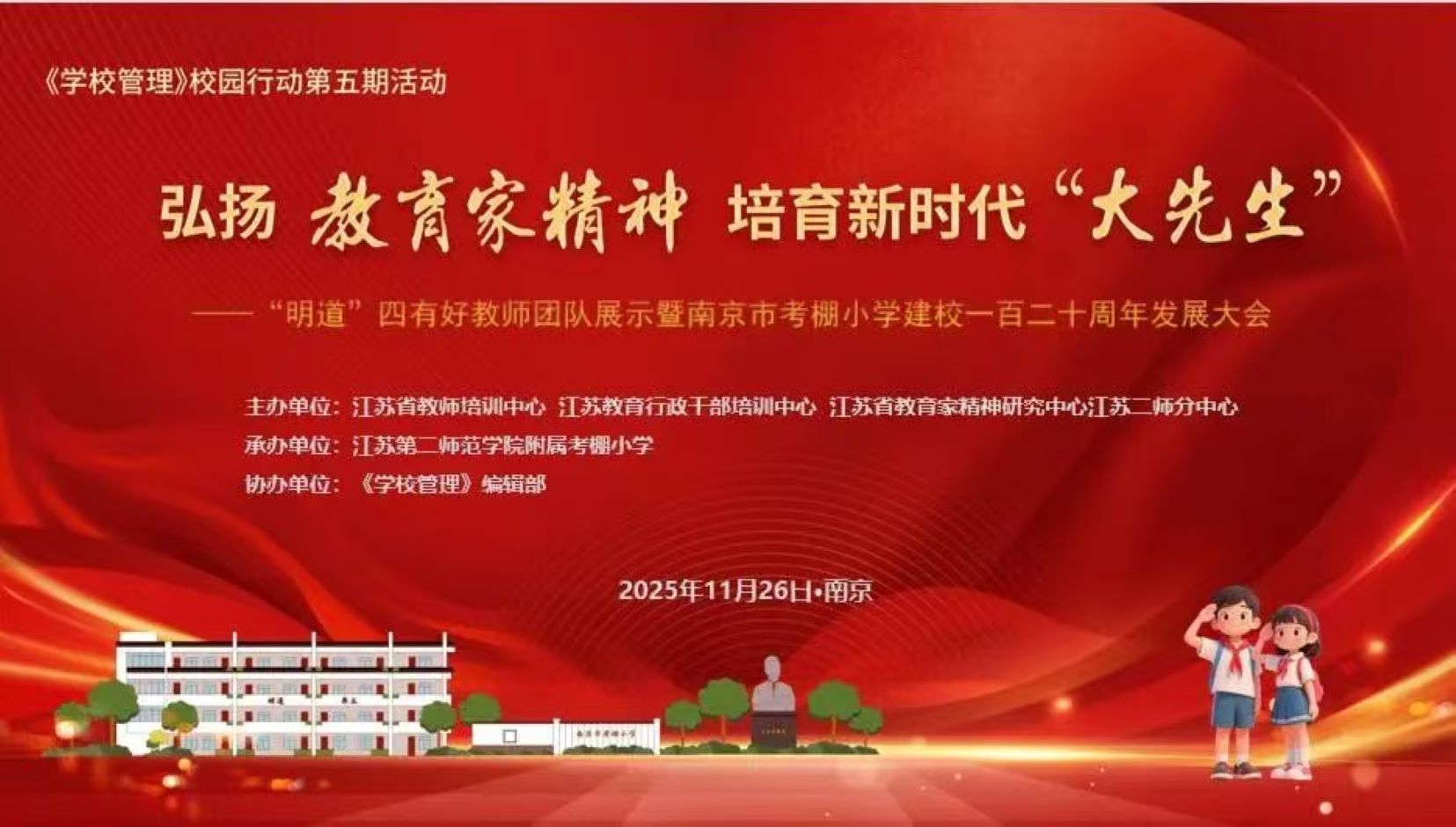 2025年11月26日,《学校管理》校园行第五期活动走进江苏第二师范学院附属考棚小学。本次活动由江苏省教师培训中心、江苏教育行政干部培训中心、江苏省教育家精神研究中心江苏二师分中心主办,江苏第二师范学院附属考棚小学承办,《学校管理》编辑部协办。活动以“弘扬教育家精神 培育新时代‘大先生’”为主题,汇聚了省卓越教师项目小学教师代表、《学校管理》学术支持单位代表、高校专家等百余名教育同仁,通过成果展示、专题研讨、校本教研、专家点评等多种形式,共探育人新路径,共绘教育新蓝图。