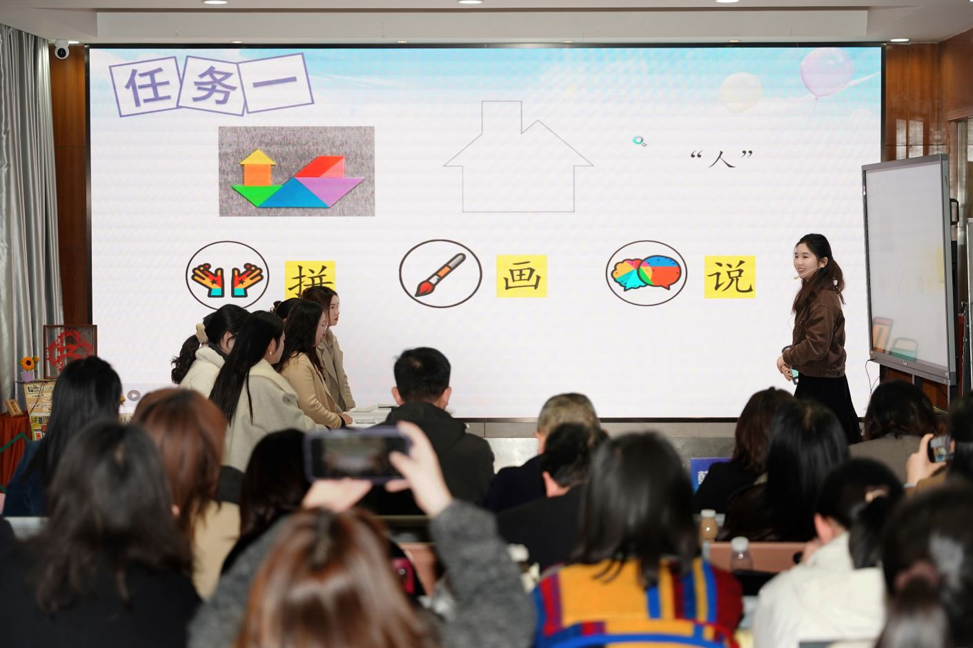 汇报结束后,考棚小学数学组骨干教师唐李欣老师带来了二年级学科融合数学活动片段课——《拼有趣的图案》。来自考棚教育集团校的六位不同学科教师化身学生参与课堂。