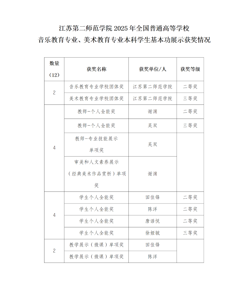 近日,教育部公布了2025年全国普通高等学校音乐教育专业、美术教育专业本科学生基本功展示评选结果,我校在本次活动中斩获12项荣誉。其中团体二等奖1项、团体三等奖1项、学生个人全能奖二等奖3项、三等奖1项;教学展示(微课)单项奖2项。教师个人全能二等奖1项、全能三等奖1项、专业技能展示单项奖1项、审美和人文素养展示(经典美术作品赏析)单项奖1项。