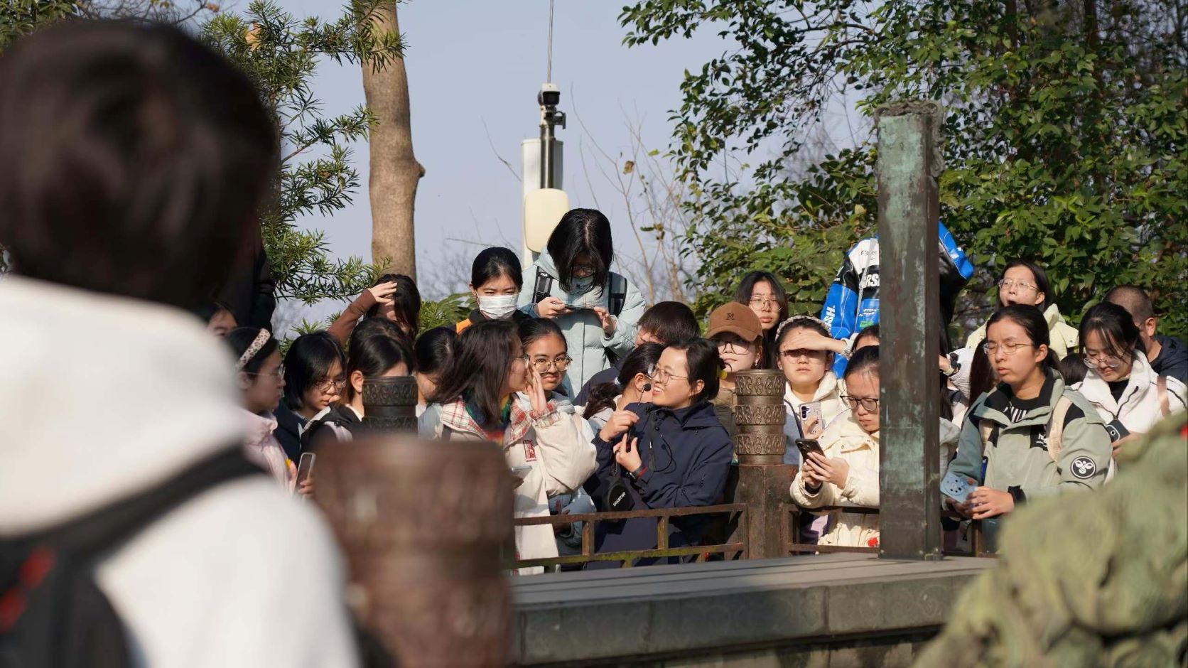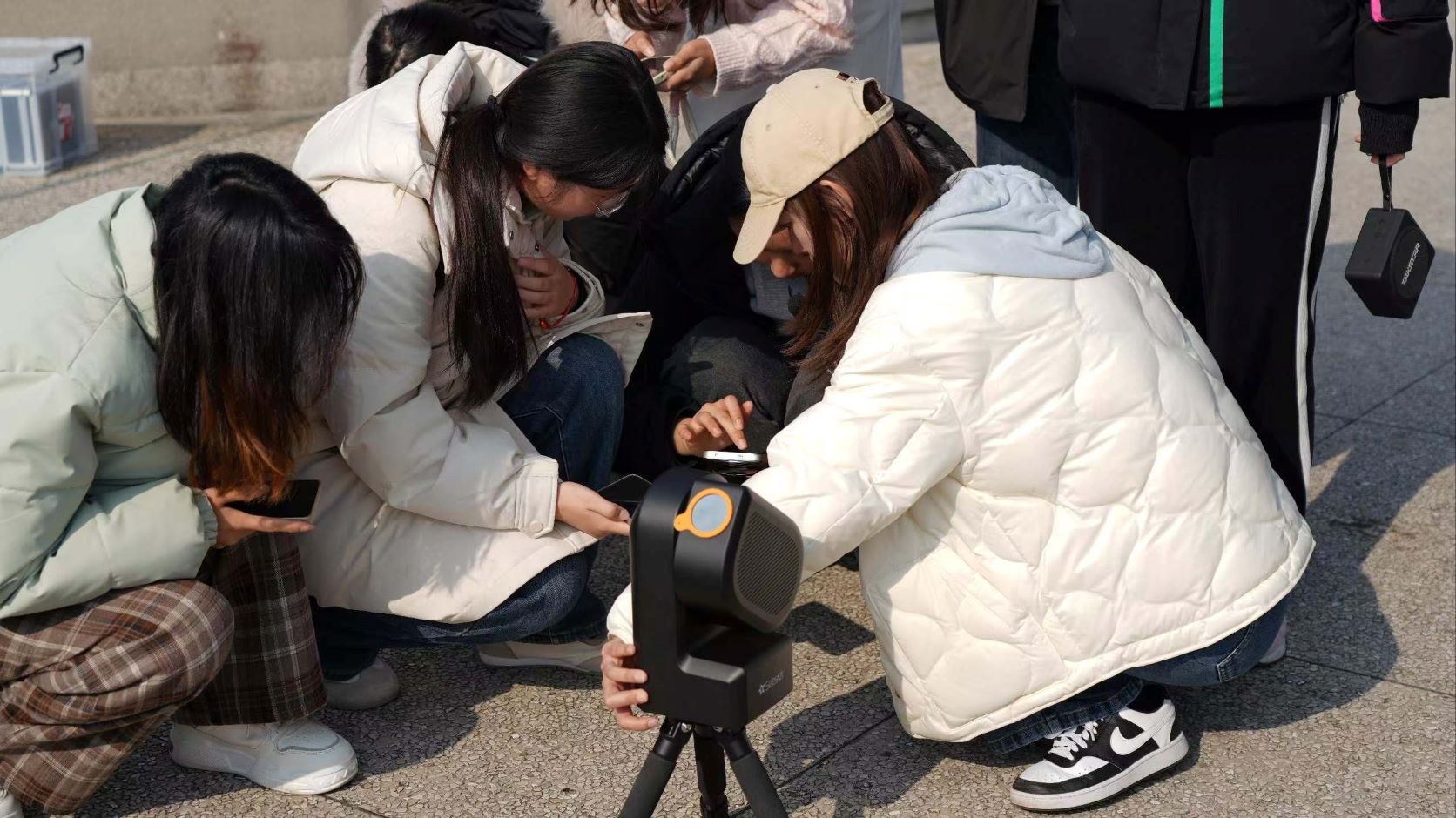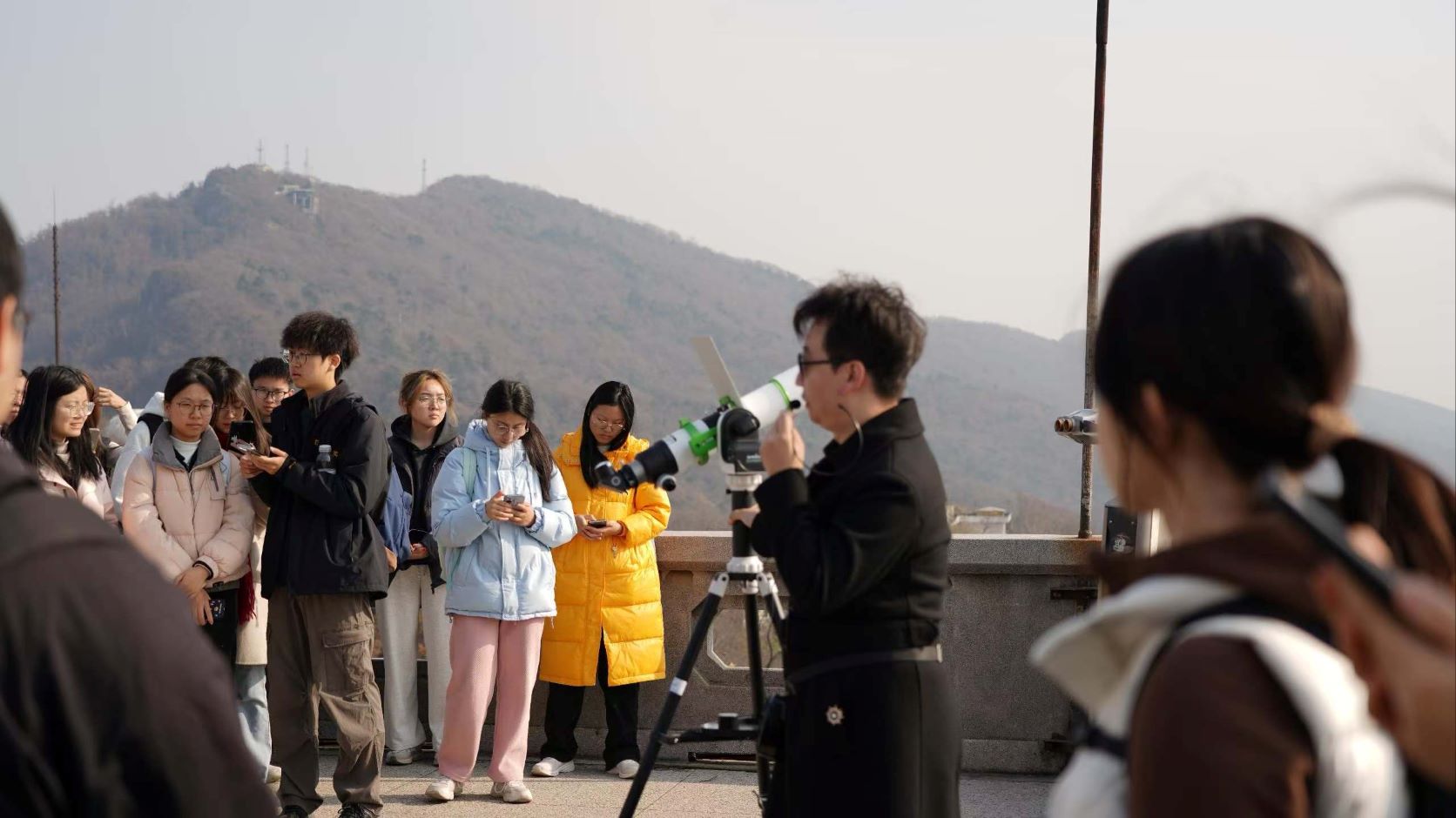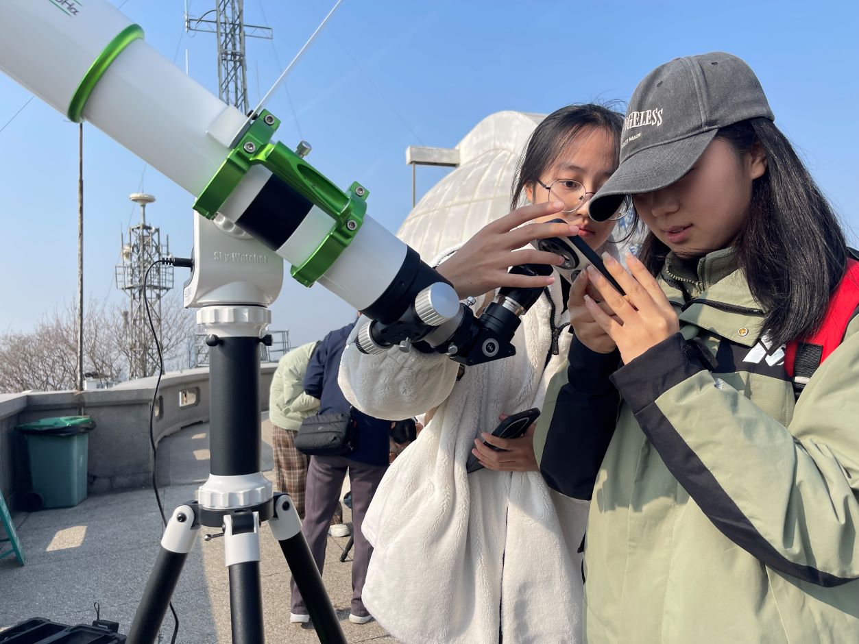 最后,全体师生齐聚天堡城观景平台,在南京师范大学陈禹光博士及研究生团队的指导下,大家亲手操作Seestar等现代天文望远镜,将目光投向太阳,亲身体验观测流程,实现了从理解古代天文思想到掌握现代观测技能的完整跨越。