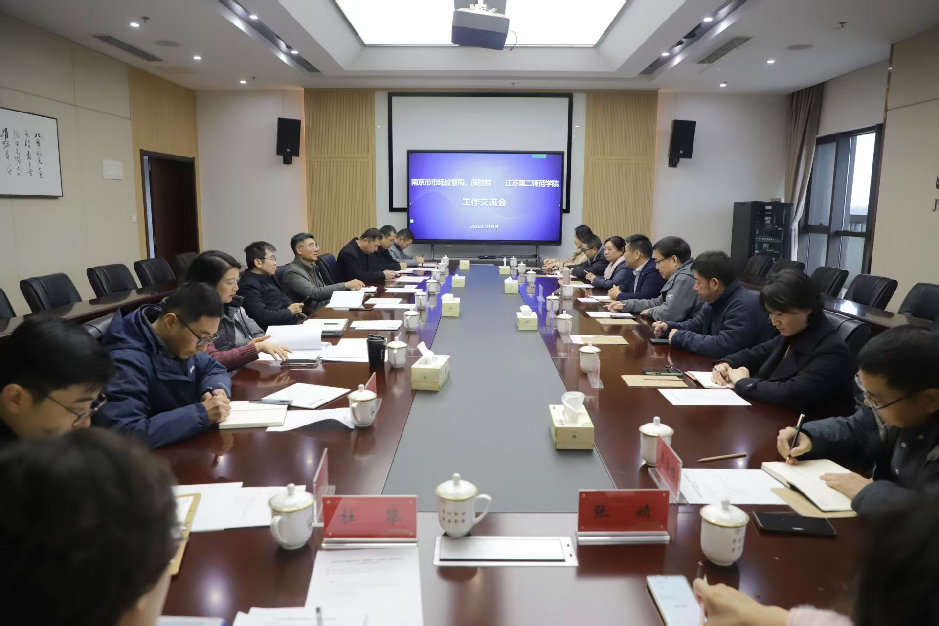 1月19日上午,南京市市场监督管理局王敏虹副局长、南京市产品质量监督检验院周骏贵院长一行莅临我校开展调研交流,校党委书记兰亚明、校长徐国华、副校长花书贵出席会议,发规处、教务处、科研处、生化学院相关负责同志参加会议。