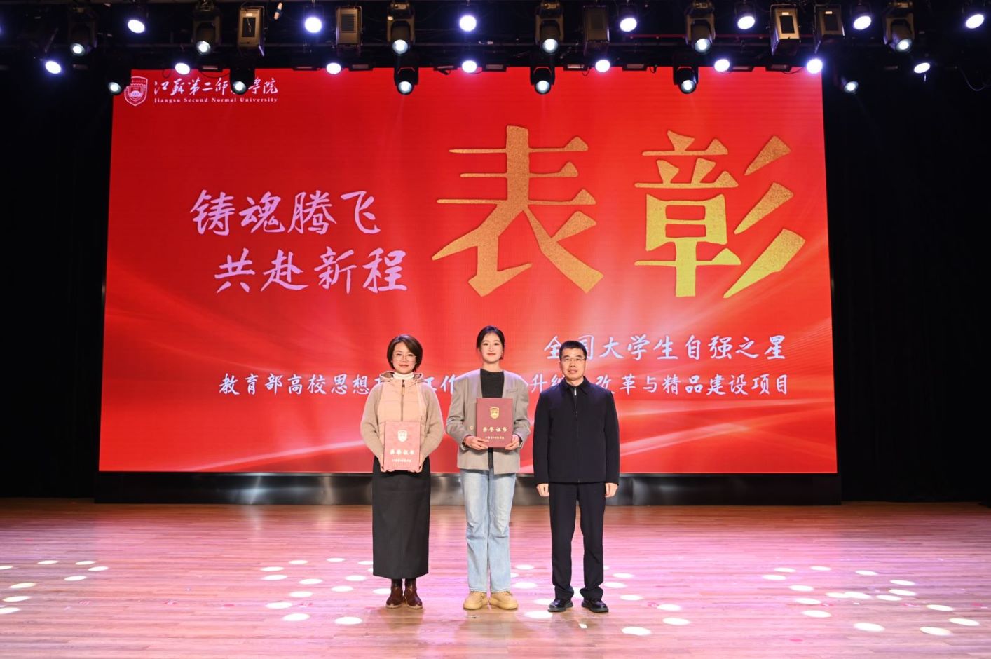 校党委书记兰亚明为荣获“全国大学生自强之星”、教育部高校思想政治工作质量提升综合改革与精品建设项目的团队代表颁奖。
