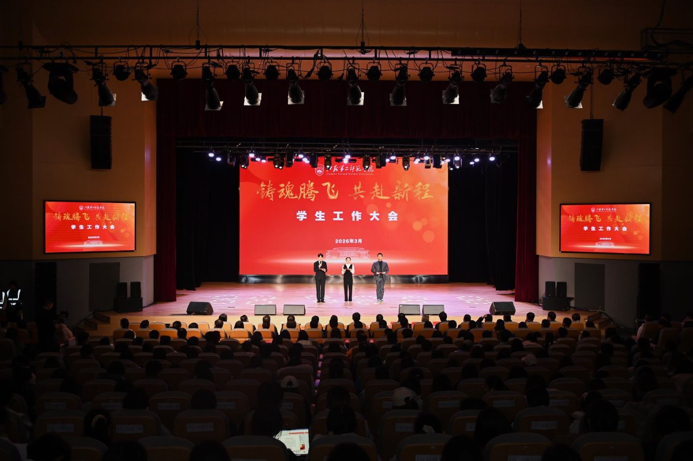 春启新程,万象更新;初心如磐,奋楫笃行。3月18日,我校“铸魂腾飞・共赴新程”2026年学生工作大会在石湫校区尚美楼二楼报告厅举行。校党委书记兰亚明,校长徐国华,党委常委、副校长花书贵,党委常委、宣传部长李安林,党委常委、组织部长杨思贤等出席大会,江苏省教育基金会理事长张兆臣、副秘书长张虎成,南京大学团委书记曹晨受邀莅临。校学生工作指导委员会委员、二级学院(学部、书院)党总支书记、全体辅导员、学生代表等齐聚一堂,共话学生工作新发展,共绘育人育才新蓝图。大会由辅导员李青、学生代表姜景元、陈吉共同主持。