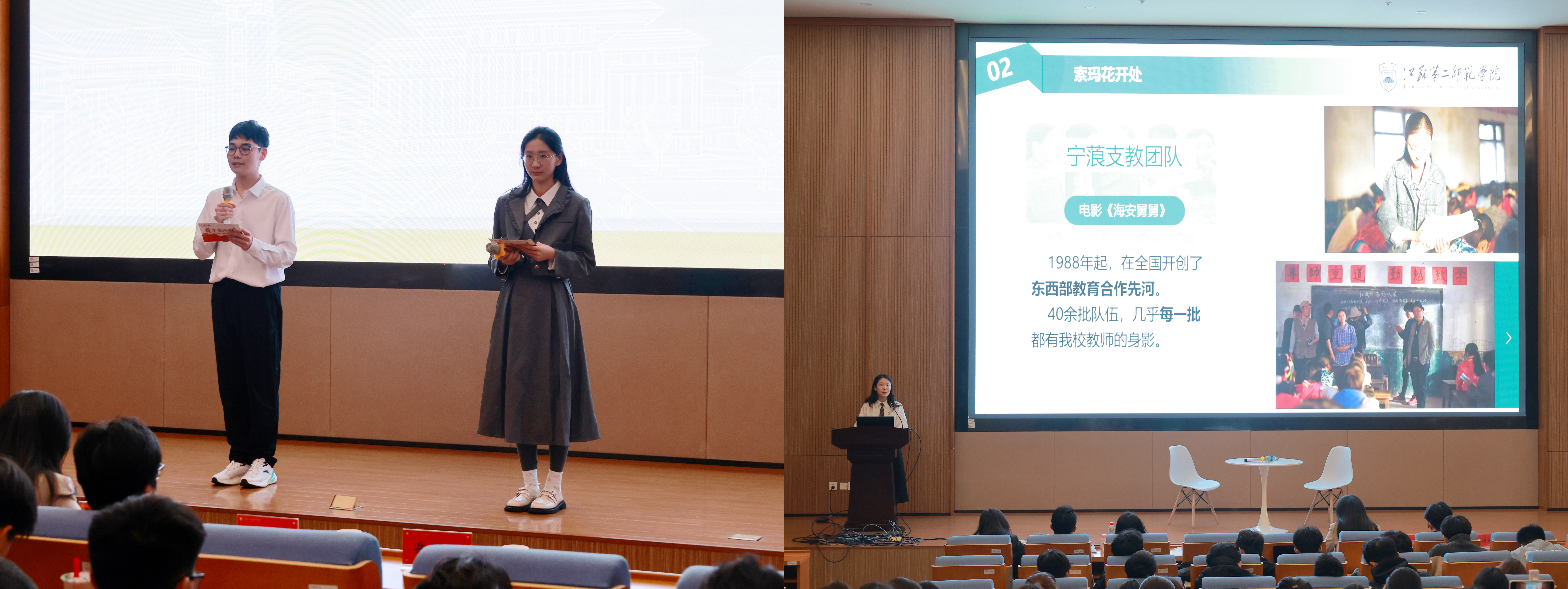 徐悦然同学以“勤耕不辍,芳华待灼——弘扬践行教育家精神”为题展开宣讲,她以图书馆门口孔子铜像为引,追溯从孔子“有教无类”“诲人不倦”到新时代支教团队、于漪先生的教育家精神传承脉络,勾勒出跨越千年的师道精神长河。崇德书院余星昊同学结合他在江西于都的支教经历,讲述与小女孩贝贝的暖心故事,贝贝“长大后要当老师找你”的话语,将立志扎根乡村教育,让青春之花绽放在基层教育沃土,让在场师生动容。学前教育专业胡江月同学从学前教育视角,诠释教育家精神的温度,表示将教育家的育人智慧融入乡村幼儿日常点滴,以坚守与奉献践行育人使命,让教育之光点亮乡村振兴之路。